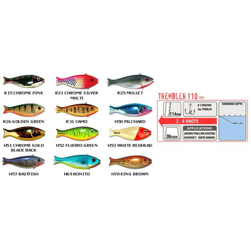 Whether you troll, jig or cast, the Trembler 110 does it all. It can be trolled up to 8 knots for smaller pelagic species and river species. The lure is noisy (due to the rattles) and has a fast tight action. Often anglers use too much vigor in the jigging action, try a slower upward movement and let the lure descend at a medium pace. What makes the Trembler 110 unique is that it actually has a swimming wobble action as the lure drops.