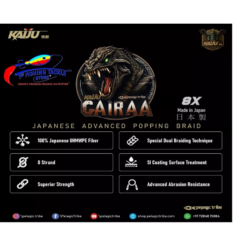 KAIJU, a Pelagic Tribe Brand, uphold the Japanese tradition of craftsmanship and excellence in their fishing line products. They use 100% UHMWPE fibers from Japan and apply advance eight-strand braided and special dual braiding techniques to produce a strong, smooth, and flexible line with exceptional hydrophobic and high abrasion resistance properties. KAIJU's commitment to superior casting performance is further enhanced by their special SI coating surface treatment, which minimizes water absorption and reduces heat. KAIJU's fishing lines are designed for the most demanding fishing conditions, especially for Monster fish, providing unparallel strength and advanced abrasion resistance.