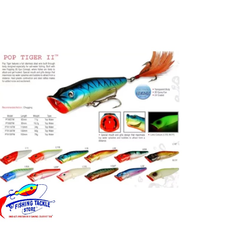 Pop Tiger features a full stainless steel wire built through body designed especially for salt-water fishing. Built with new Popping 3D Eye Concept, where fishes are likely to attack and get hooke